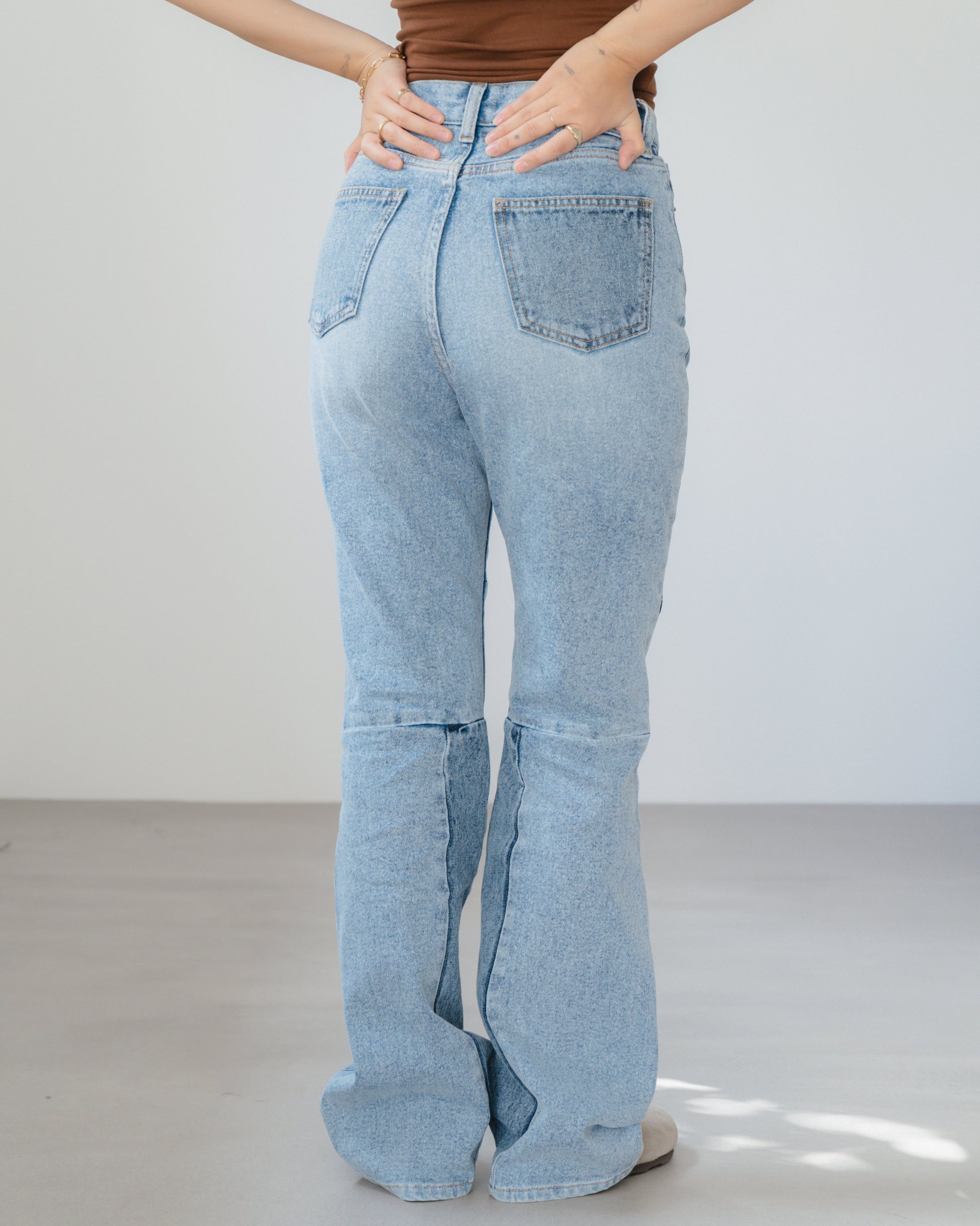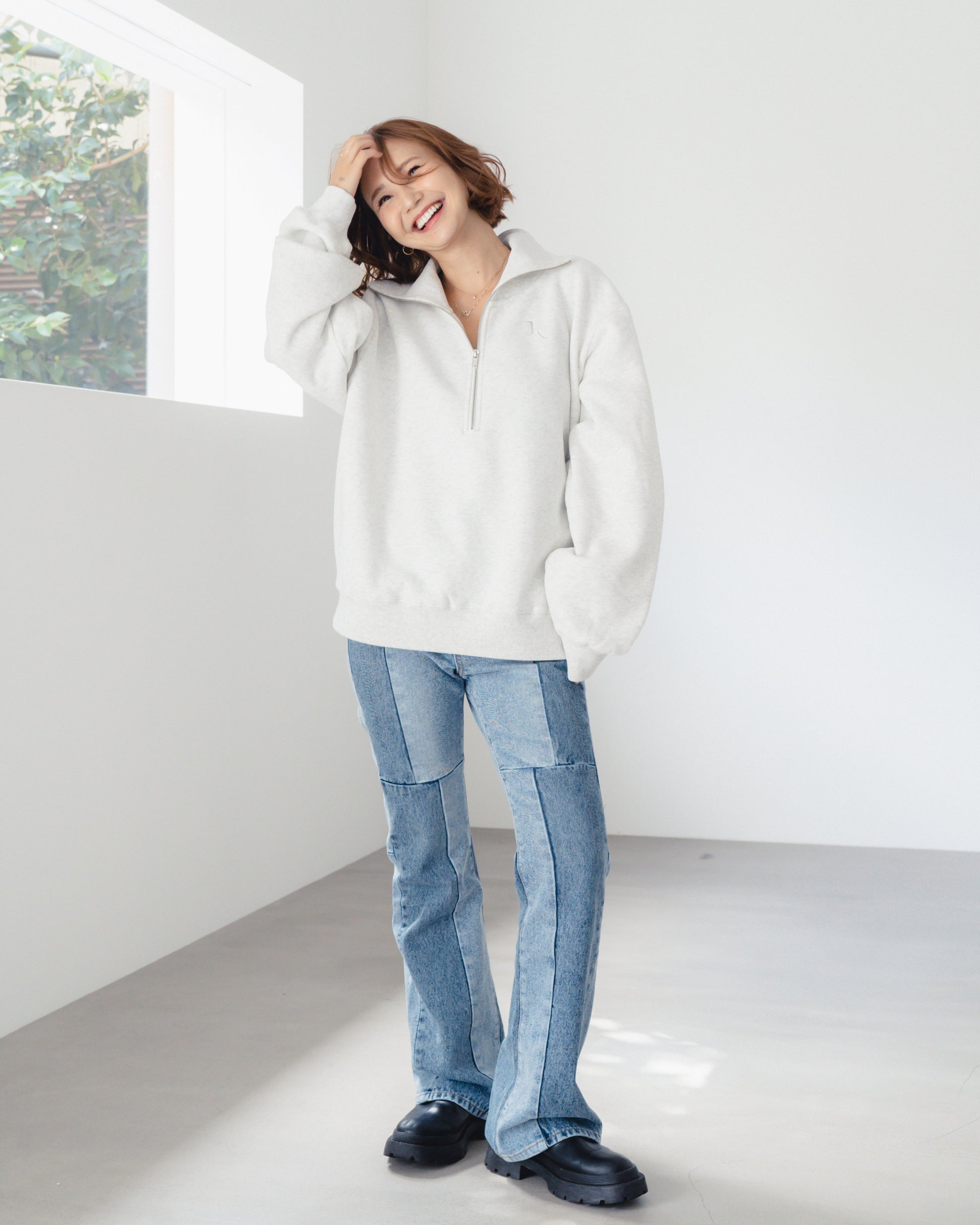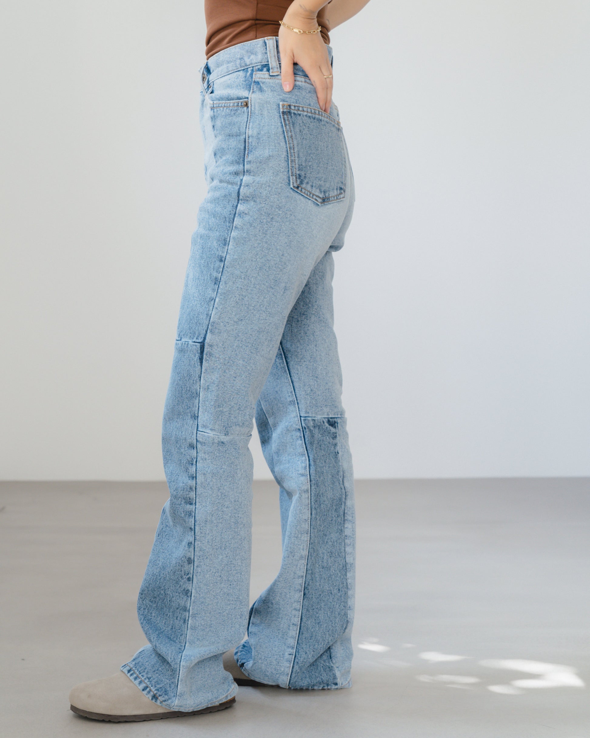 異素材のパッチワークが目を惹く、個性派デニム。